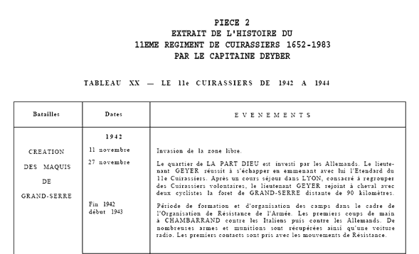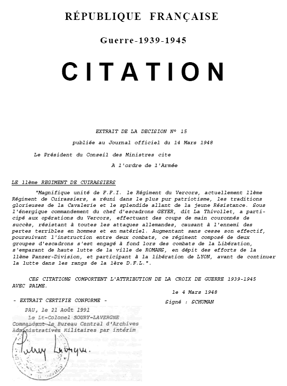 Le 11éme cuirassiers se trouvait dans le Vercors. Il fallait bien qu’il y soit ; ne s’agissait-il pas de défendre l’honneur de la France ? Il suivait sa devise "Toujours au chemin de l’honneur", le Vercors était sur ce chemin. Probablement pas par hasard.