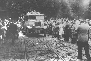 Bientôt, la rue est noire de monde. La foule en délire submerge les jeeps, grimpe sur les chars, s'agrippe aux poignées, aux panneaux, aux canons et aux mitrailleuses et transforme les chars, où les robes claires des jeunes femmes dominent, en chars de carnavals.