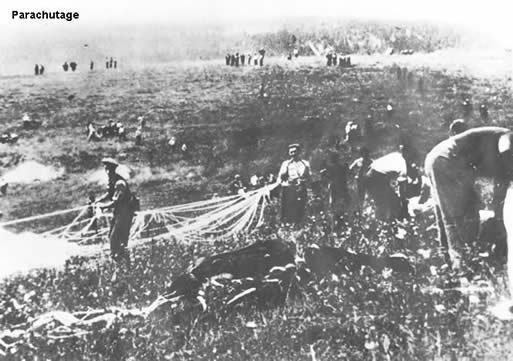 Le 14 Juillet nous recevons en plein jour un important parachutage effectué par 90 "forteresses volantes". A peine une demie heure après la fin de cette opération, les avions allemands arrivent sur les lieux, bombardent Vassieux, Saint-Martin, La Chapelle-en Vercors; mitraillent tout ce qui bouge sur les routes du Vercors.
